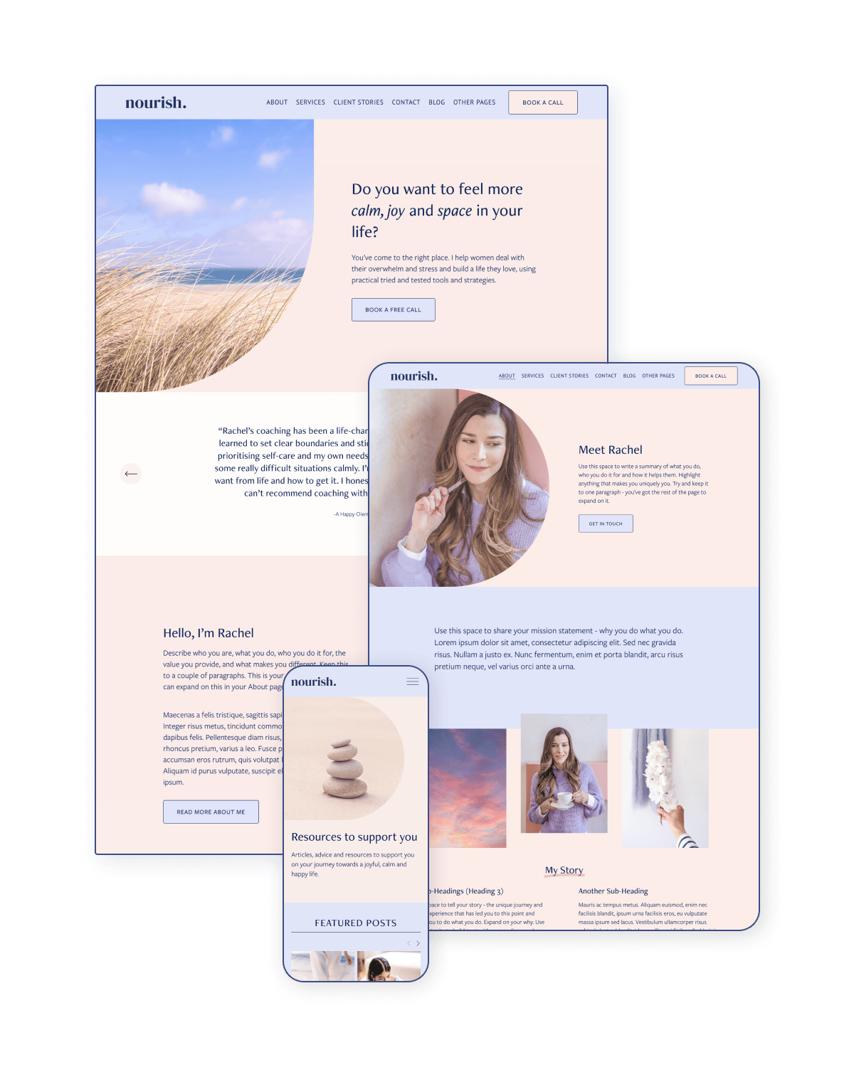 Nourish is a light and airy modern template designed for service providers like life coaches, business coaches, therapists, counsellors and more.